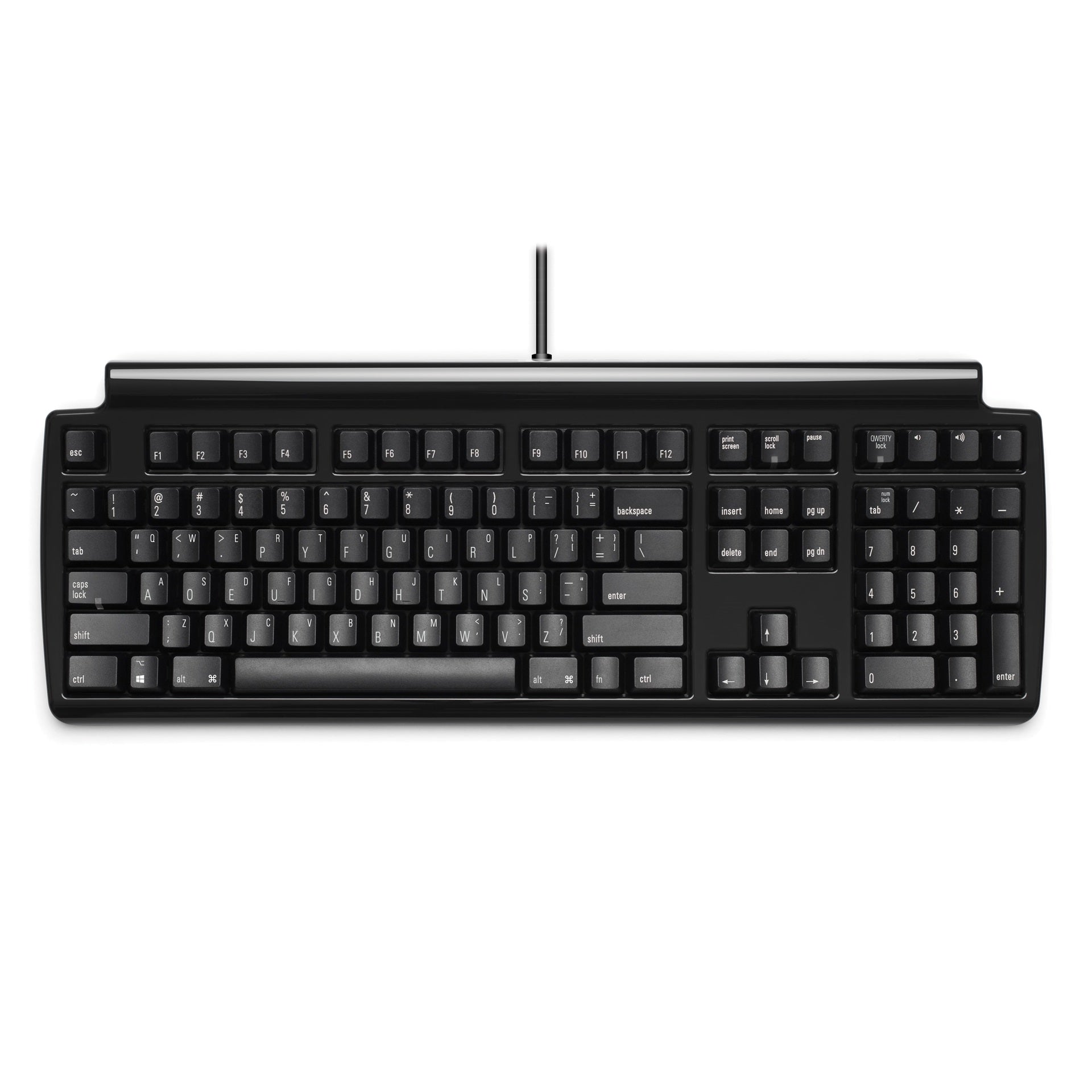 The keyboard is labelled with both Dvorak and QWERTY key legends, so you can easily see which key is which.