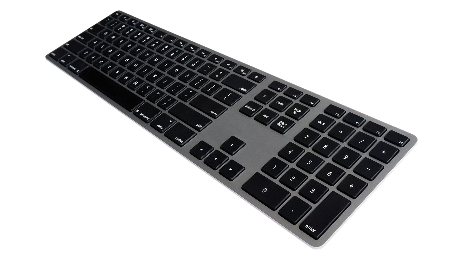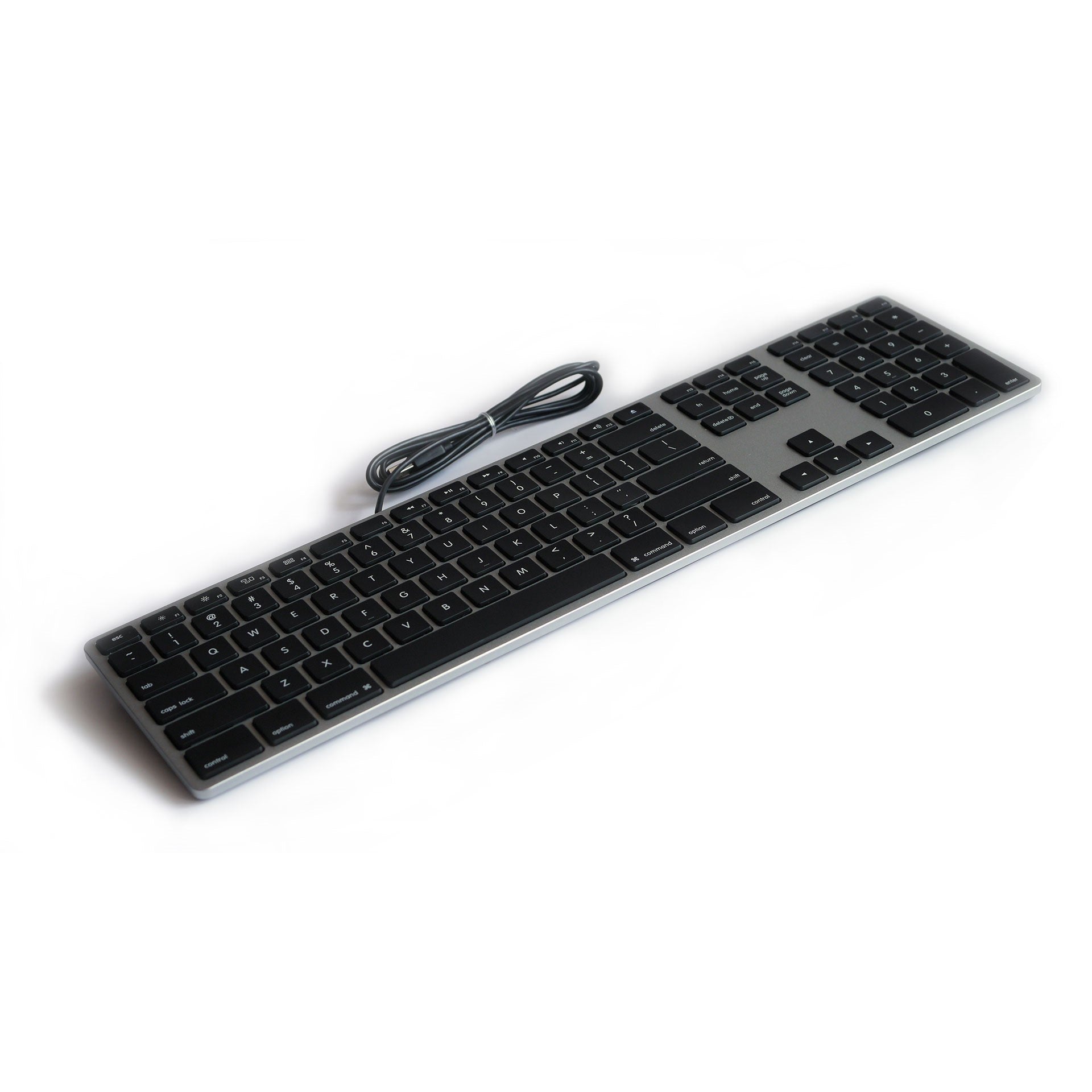 The "Matias Wired Aluminum Keyboard for Mac - Space Gray" is for people who miss Apple's wired USB keyboard. Many people still like the reliability of a traditional USB 2.0 connection, with a two port USB 2.0 hub and numeric keypad. This keyboard has a space gray aluminum frame and black keycaps. This keyboard by Matias has all the special Mac functionality you expect on the function keys. The keyboard has one special function that improves upon the original Apple keyboard ... there is a volume control dial on the top edge of the keyboard that gives you more precision in controlling volume than using the keys; however, if you are a traditionalist, you can still control volume with keys on the Matias keyboard, just like the Apple one.
